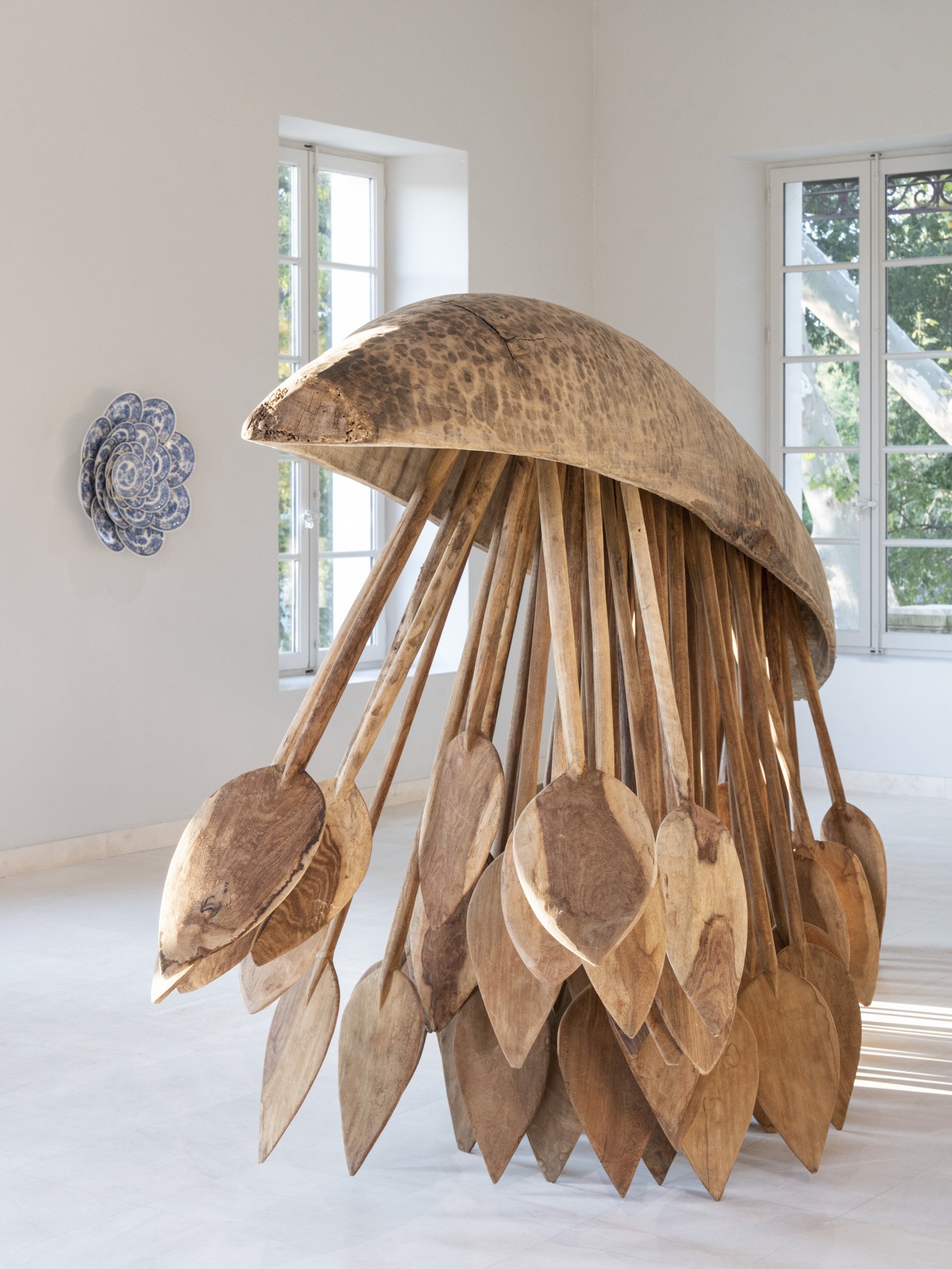 Au centre de l’exposition, Toumaï (2024), assemblé à partir d’une pirogue en bois de Casamance et de nombreuses pagaies, déploie sa présence monumentale. Par son échelle, l’œuvre se fait à la fois structure architecturale et organisme, corps suspendu dans l’espace. Ancrée au milieu des conversations des Roses des vents, elle paraît à la fois immobile et vivante, comme si elle renfermait la mémoire d’un être organique ancien. Le bois conserve l’empreinte des gestes de transformation, et l’œuvre évoque un vaisseau archaïque, peut-être même le fossile d’un insecte primordial tel qu’un mille-pattes géant. Elle renferme un savoir sur la circularité du temps et de la vie, ainsi que sur la relation entre la terre et l’eau. Toumaï fait référence au plus ancien ancêtre hominine connu en Afrique et évoque les débuts de l’humanité comme une longue histoire de migrations. La sculpture incarne l’origine, les premières formes de voyage et de survie, tout en se faisant métaphore de la puissance du collectif. Dans sa monumentalité et sa quiétude, elle entraîne le spectateur dans un rythme suspendu. De ce point d’ancrage, la vidéo Toujours sur cette mer sauvage (2022) déploie un espace imaginaire où la mer n’apparaît plus comme une séparation mais comme un élément de connexion.