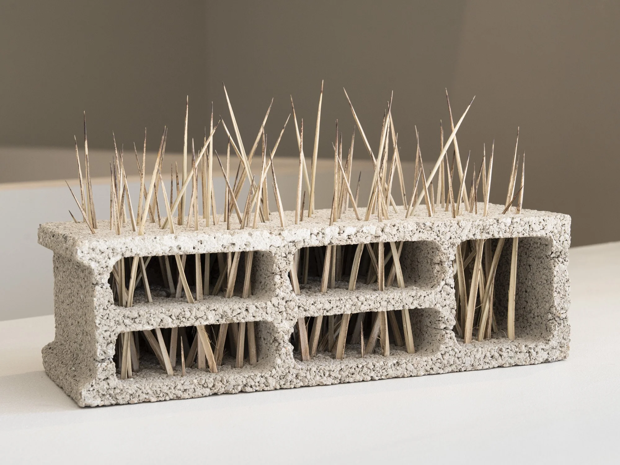Après ces méditations sur la lignée, La Première Pierre (2022) nous ramène aux fondations. Une simple brique de ciment, pierre fondatrice d’une maison familiale, incarne un geste d’ancrage. Cependant, les épines de palmier dattier qui la traversent évoquent les obstacles liés au désir de foyer et de stabilité. Avec sa référence aux processus souvent lents et socialement chargés de construction d’une maison en diaspora, l’œuvre transforme à nouveau le matériau quotidien en corps résonant, réorganisé et recontextualisé.