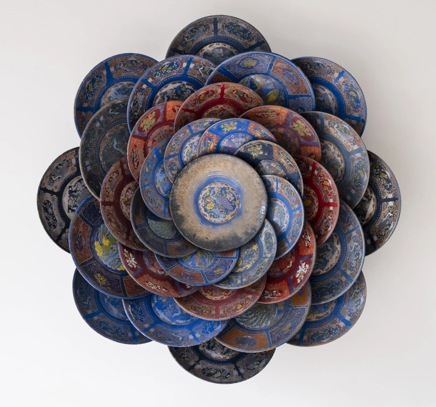 Des assemblages d’assiettes en porcelaine prolongent ce motif dans d’autres cycles de matériaux. Produites aux XIXe et début du XXe siècle, ces porcelaines témoignent d’une époque où leurs fabrications industrielles au sein des Empires européens constituaient un symbole de l’ordre bourgeois et une quête de distinction culturelle. Dans les comptoirs coloniaux, les assiettes, les tasses à thé et les services de table servaient de signes de raffinement et de civilité européens. Leur possession et leur usage permettaient aux élites coloniales d’afficher leur appartenance à la culture impériale et à ses structures de pouvoir économique. Ces objets témoignent d’une autre forme de mobilité — celle du privilège, portée par l’expansion capitaliste et la séparation sociale. Dans la tradition de l’assiette murale, ce qui semble être un objet domestique « inoffensif » se révèle en réalité porteur d’idéologies coloniales, dont les traces matérielles et symboliques persistent jusqu’à aujourd’hui.