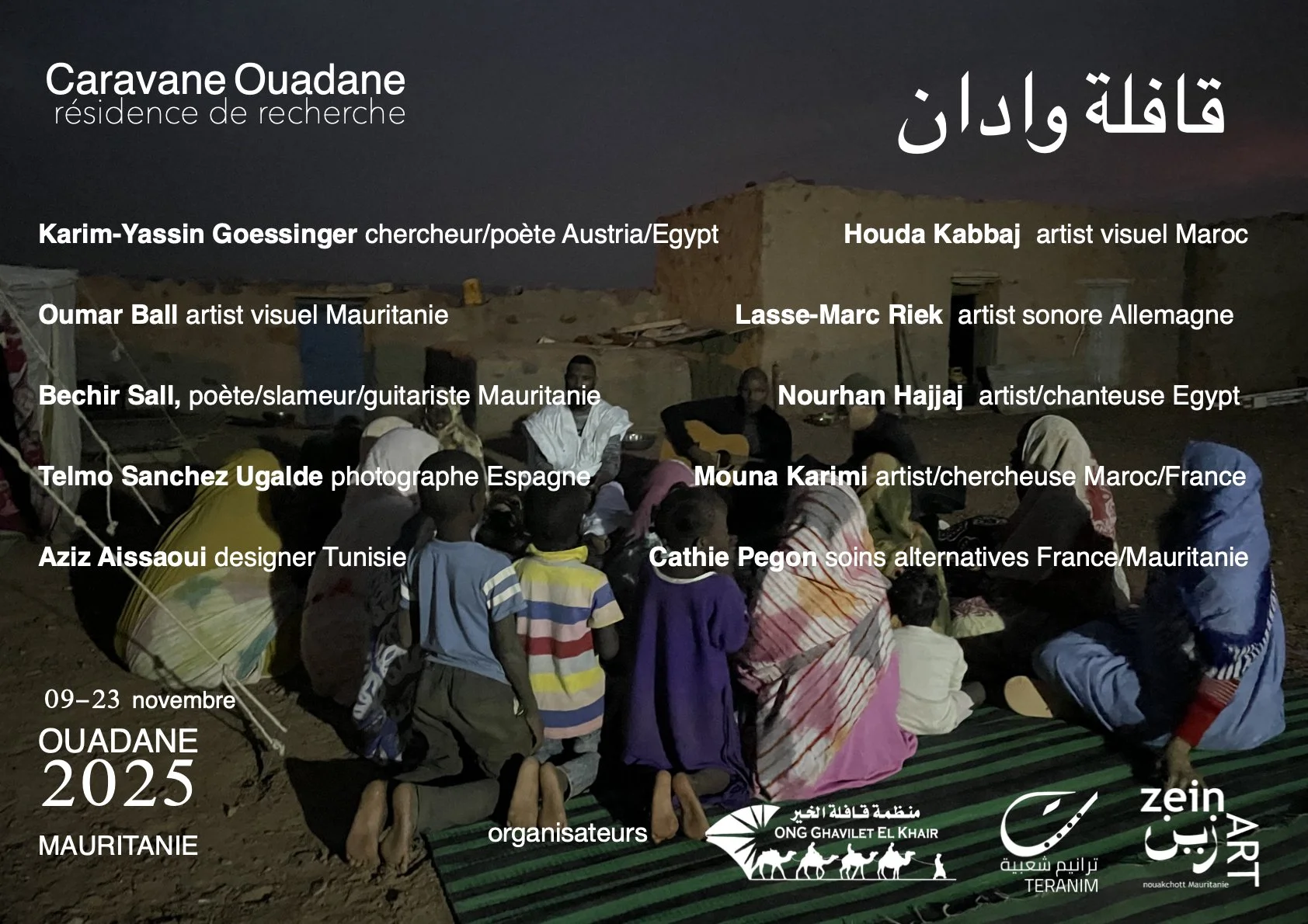 Depuis sa création, la Caravane Ouadane a accueilli de nombreux artistes, chercheurs, sociologues, architectes, astronomes, chorégraphes, danseurs, musiciens, conservateurs, poètes, choisis en fonction de leur intérêt pour la vie et l’histoire des oasis du désert. À travers des échanges, des rencontres et des ateliers, les participants enrichissent leurs recherches et projets liés à Ouadane, aux cités oasiennes ou au désert. Ces moments de partage permettent aux populations locales d’appréhender leur environnement et leur quotidien sous un nouveau regard. Les plus jeunes bénéficient notamment d’ateliers pour découvrir d’autres langages de communication et de compréhension du monde, tels que le dessin, la photographie, la danse ou la musique. Ces passages artistiques offrent ainsi un nouveau rayonnement à la cité oasienne de Ouadane à travers l’art contemporain.