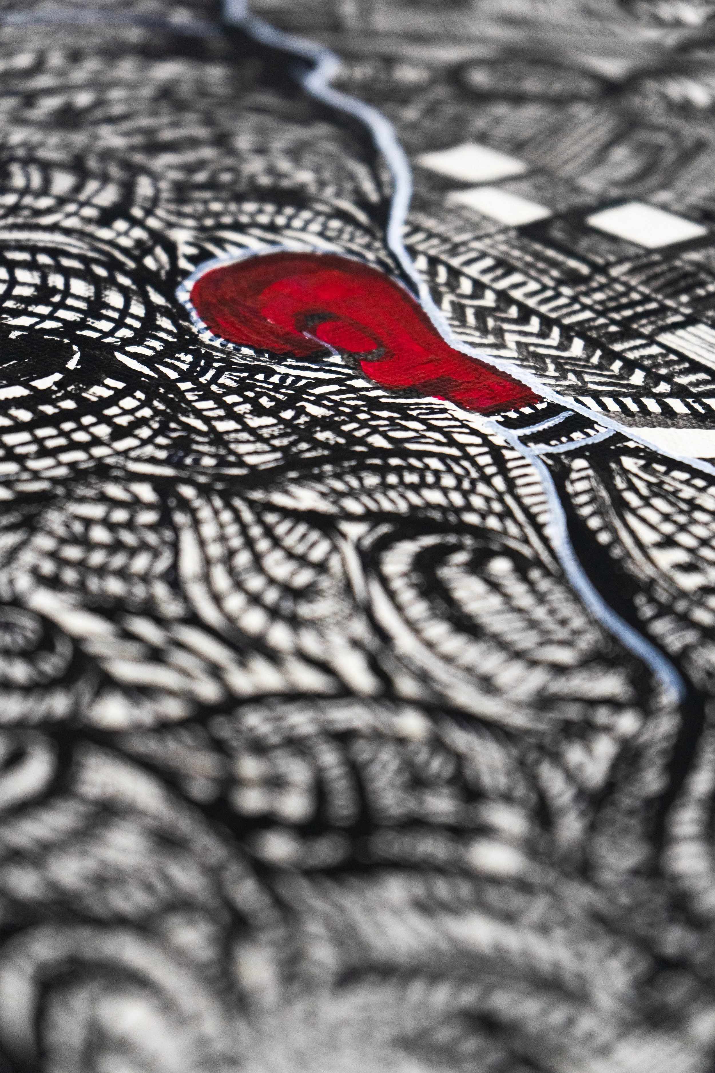 Son exposition Talataay Nder, en 2023, associait la représentation figurative d’un événement historique à des constructions suspendues et à une performance chorégraphique, en mémoire des femmes de Nder qui, en mars 1820, défièrent l’assujettissement et l’exploitation en choisissant l’immolation plutôt que l’humiliation de la capture et de l’esclavage. Lune suggère la puissance et la force collective de ces femmes au moyen de surfaces lignées et de corps entrelacés dans une étreinte communautaire, dont les formes puissantes évoquent la lutte, la solidarité mutuelle et l’amour. Ces formes étroitement lignées rappellent à la fois les cartes topographiques et les ornements corporels, renvoyant ainsi à la fois à la terre natale et aux traditions de beauté féminine. Dans l’espace d’installation, Lune suspendait au plafond, à l’aide de fils, des sacs en plastique remplis d’eau afin de créer des sculptures pendantes retombant jusqu’au sol, comme pour suggérer des larmes ou des lustres modernistes, évoquant tout à la fois le chagrin et la célébration, la perte et l’héroïsme.
